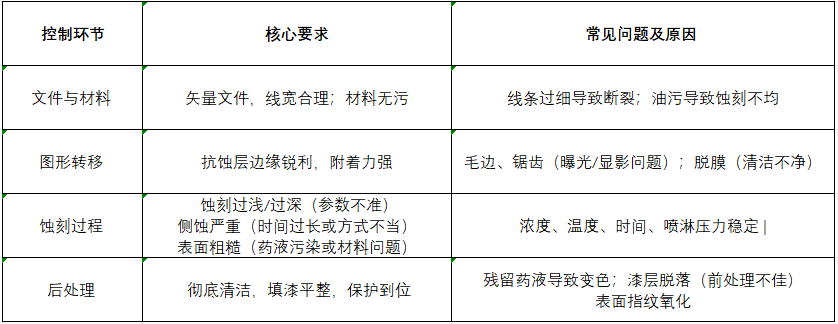 預處理:必須進行嚴格的脫脂、清潔和干燥。任何油漬、指紋都會導致保護層附著不牢,產生蝕刻缺陷。