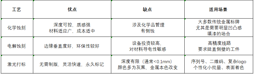 對于傳統金屬標牌,化學蝕刻應用最為普遍。以下要求主要圍繞化學蝕刻展開。