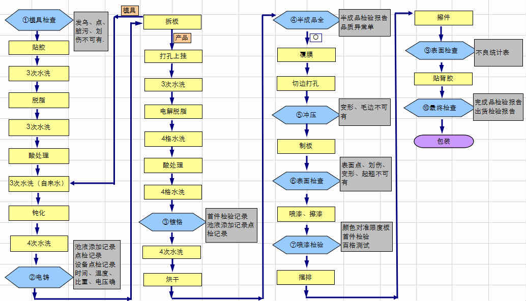 電鑄厚標工藝流程為:模具檢查→電鑄→鍍鉻→覆膜→沖壓→表面檢查→噴漆檢驗→背膠→檢查→包裝出貨