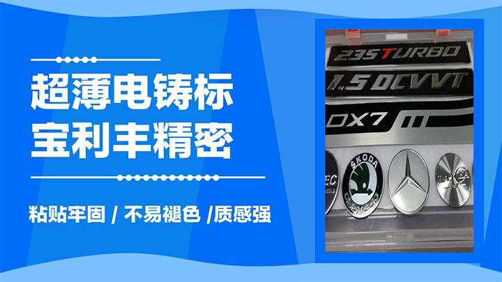 寶利豐生產的鎳標客戶群體主要應用于:數碼電子、工藝禮品、企業logo、汽車鑰匙、高爾夫球桿等等,定位中高端金屬商標的制作生產與銷售。